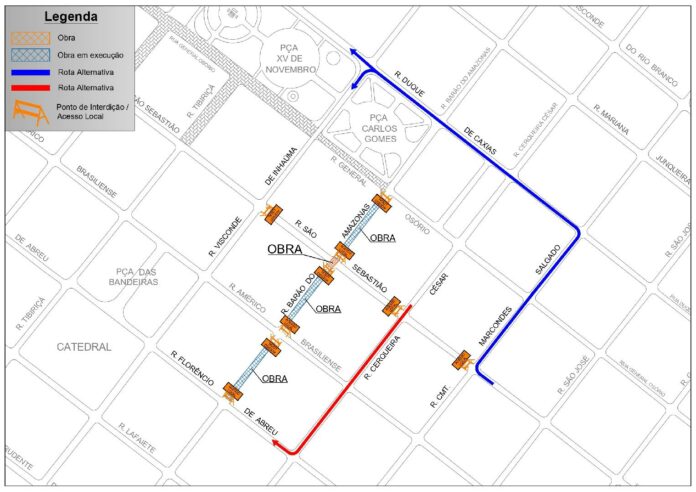 Com o andamento das obras do corredor de ônibus do quadrilátero Central, pelo programa Ribeirão Mobilidade, na manhã desta quarta-feira, dia 13 de março, haverá a interdição total do cruzamento da rua São Sebastião com a rua Barão do Amazonas, no Centro de Ribeirão Preto.