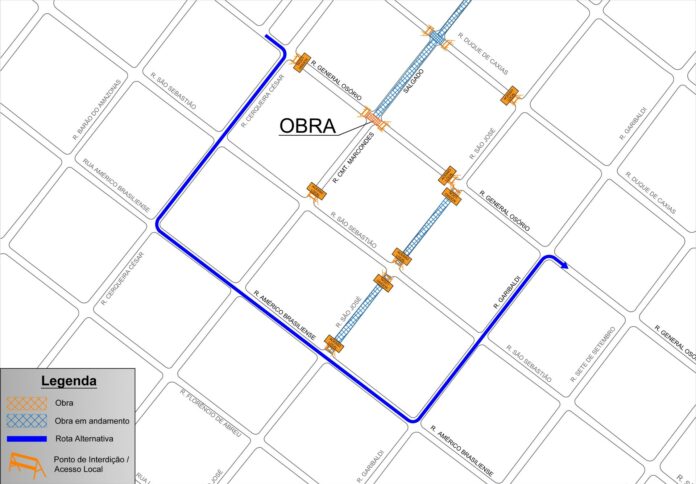 Com o andamento das obras do corredor de ônibus Nove de Julho, na quinta-feira, dia 10 de Outubro, haverá interdição total do cruzamento da rua Comandante Marcondes Salgado com a rua General Osório, região central, para implantação de rede de água potável.