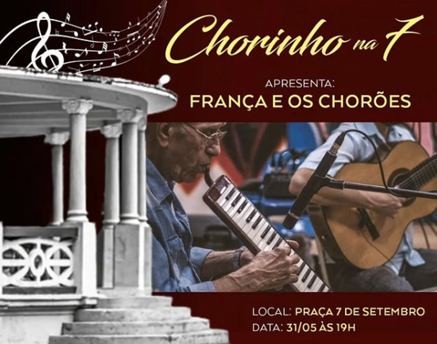 O Chorinho na 7 animará mais uma vez a Praça da Sete de Setembro apresentando “França e os chorões”.