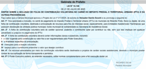 A Prefeitura de Ribeirão Preto, por meio do Diário Oficial desta quarta-feira (23), anunciou a promulgação da Lei que inclui no IPTU (Imposto Predial e Territorial Urbano) uma folha de contribuição voluntária para fins sociais.