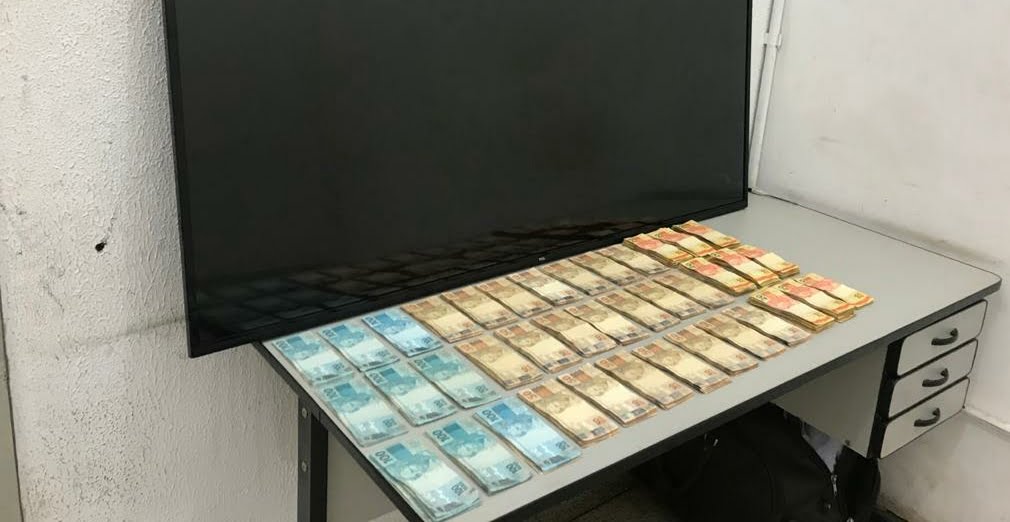 Realizada diligência em sua residência, mediante prévia autorização do abordado, foi encontrado objeto de origem desconhecida – uma TV Led 65′ – , possivelmente, resultado de ação criminosa e mais R$ 34.240,00 reais.