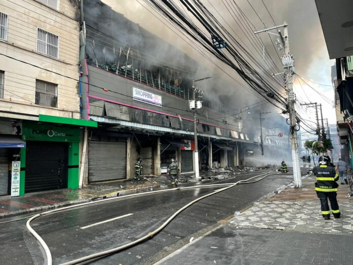 O Corpo de Bombeiros tenta apagar um incêndio no Shopping 25 Brás, na altura do número 300 da rua Barão de Ladário, no Brás, região central de São Paulo, na manhã desta quarta-feira (30).