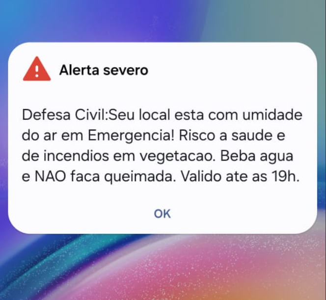 O texto do alerta severo informa: “Seu local está com umidade do ar em Emergência! Risco à saúde e de incêndios em vegetação. Beba água e NÃO faça queimada. Válido até as 19h.”