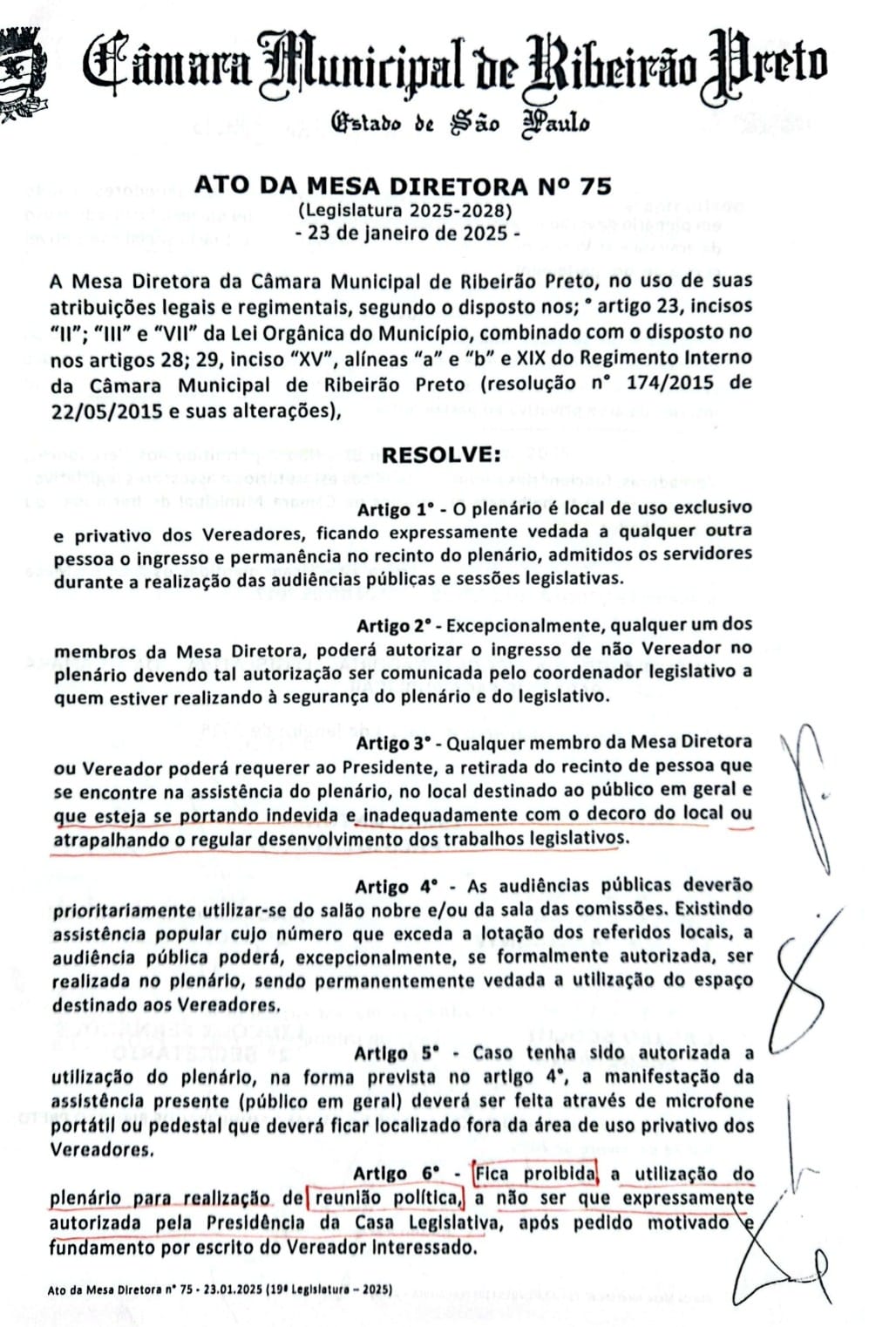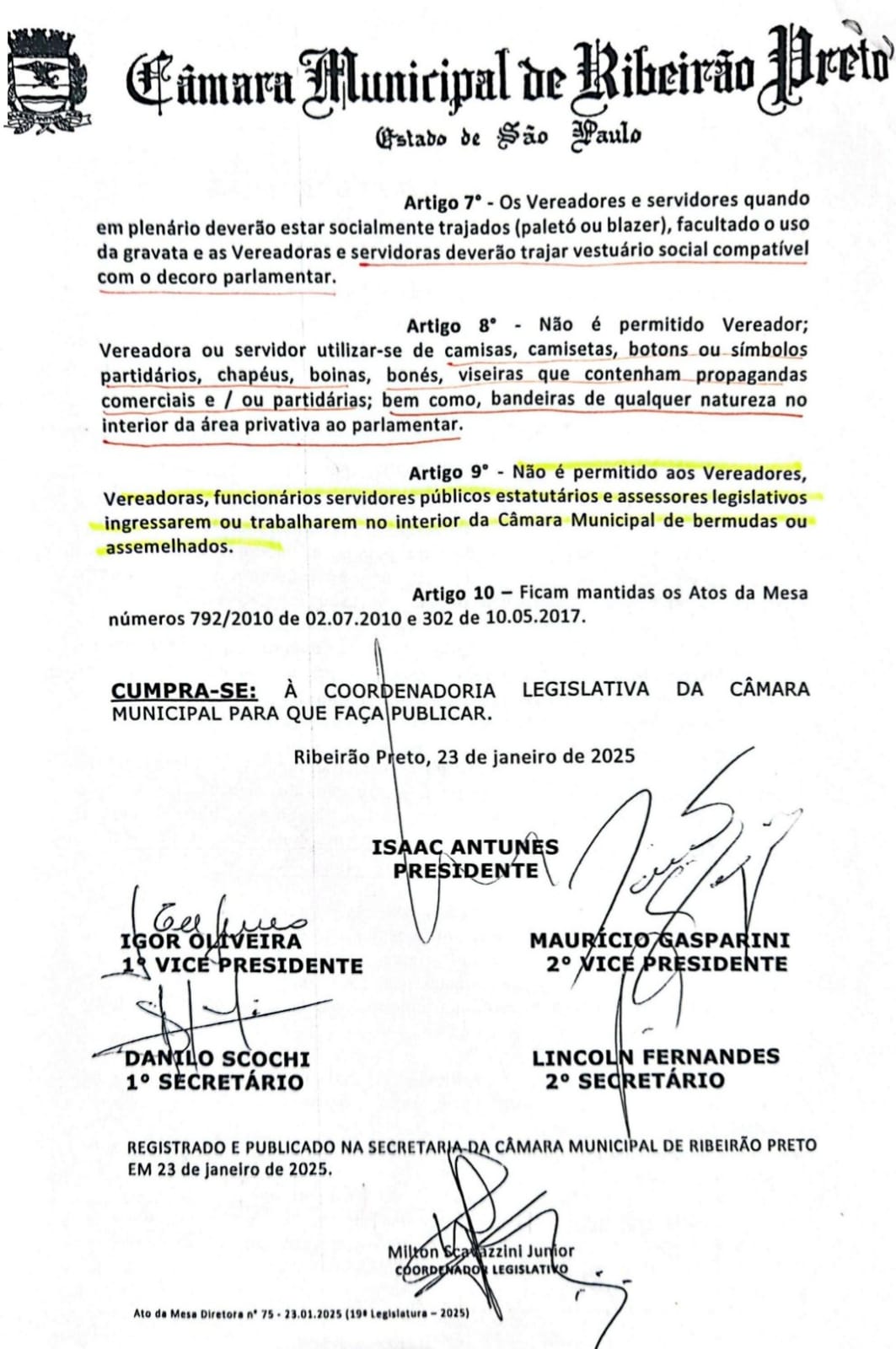 As novas normas de comportamento da Câmara de Ribeirão Preto foram publicadas em 23 de janeiro de 2025 e já estão em vigor. Todos os políticos da Mesa Diretora assinaram o texto N° 75, além do coordenador do legislativo, Milton S. Júnior.