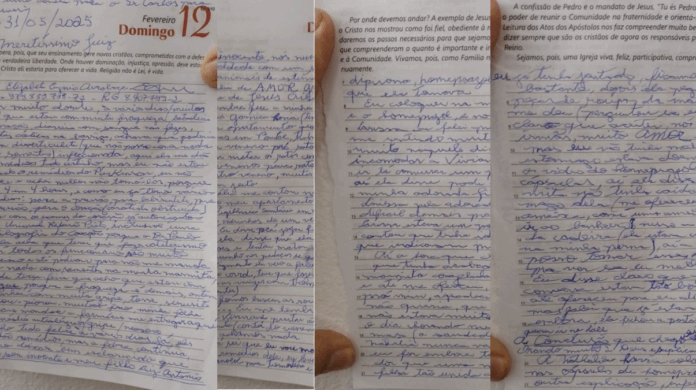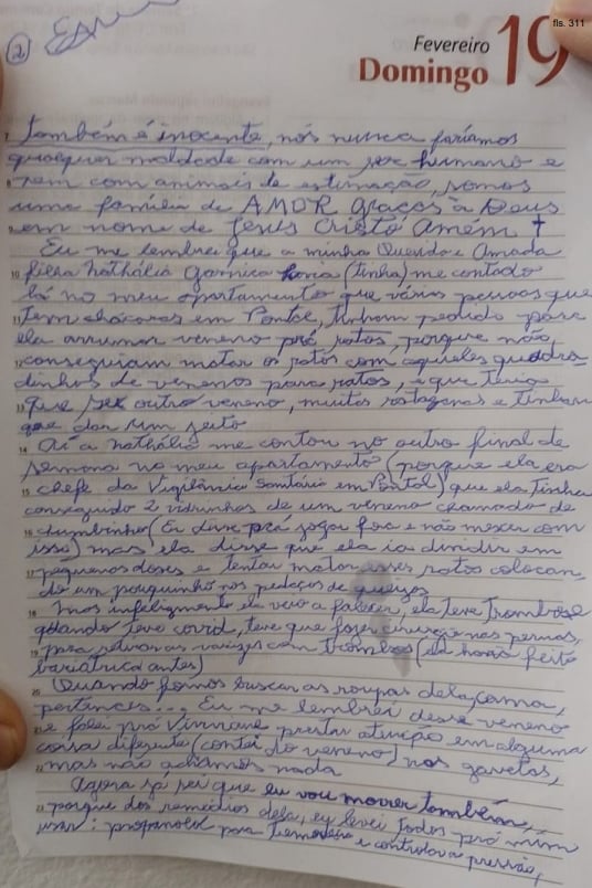 “Aí a Nathália me contou no outro final de semana, no meu apartamento (porque ela era a chefe de vigilância sanitária em Pontal) que ela tinha conseguido dois vidrinhos de um veneno chamado de chumbinho”, continua a carta. “Disse que ela ia dividir em pequenas doses e tentar matar os ratos colocando um pouquinho nos pedaços de queijo. Infelizmente, ela veio a falecer”, continua o relato escrito em cinco folhas de uma agenda.