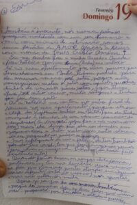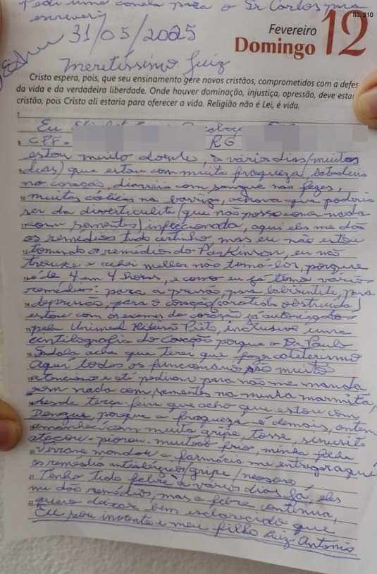 Ainda tratando sobre a saúde, a idosa suspeita de um quadro de dengue desde terça-feira (27). “A fraqueza é demais, ontem amanheci com muita gripe, tosse, sinusite”, escreveu. “Eles me dão remédio, mas a gripe continua”, explica a idosa detida.