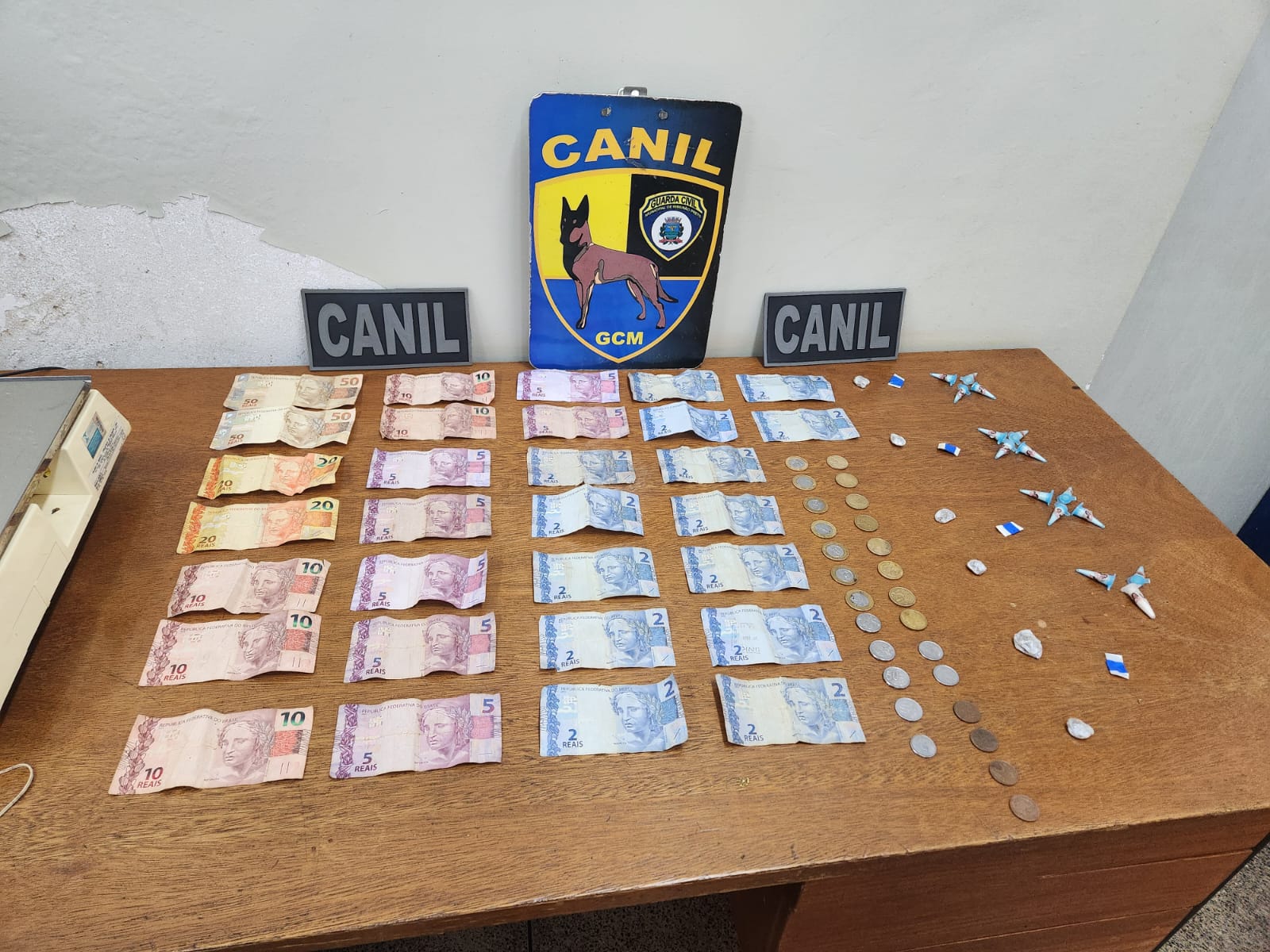 Em abordagem, foi constatada no pacote a presença de 4 porções haxixe, 7 porções de maconha tipo colombiana, 15 eppendorfs de cocaína e R$ 264,45 em dinheiro trocado.