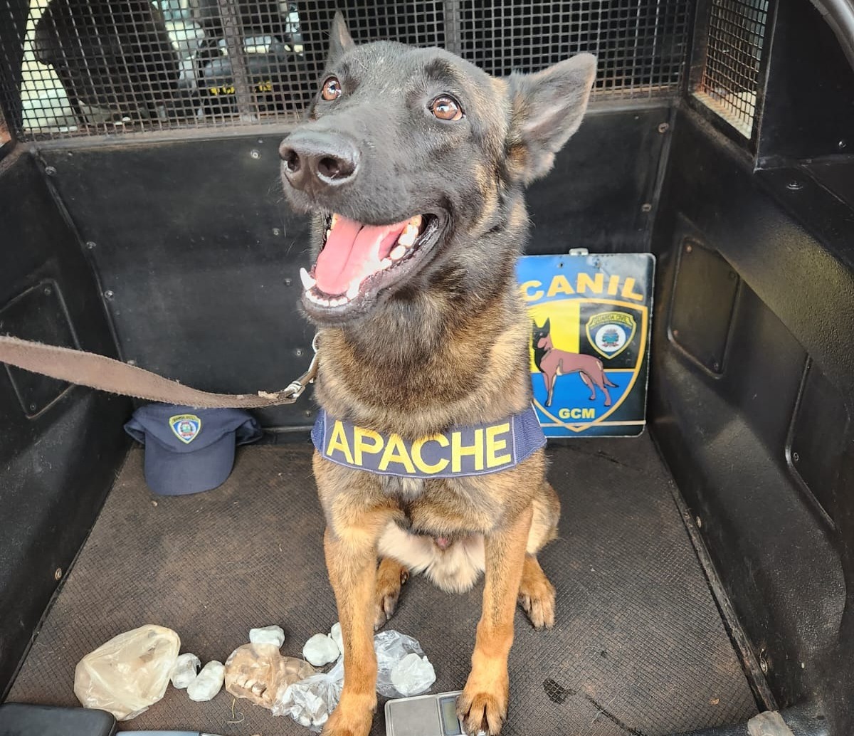 No terreno, foi solicitado o apoio do canil. O K9 Apache localizou o entorpecente coberto por folhas secas, ao pé de uma árvore. Ao todo, foram localizados 52 porções de maconha e 41 porções de cocaína, além de duas balanças de precisão.