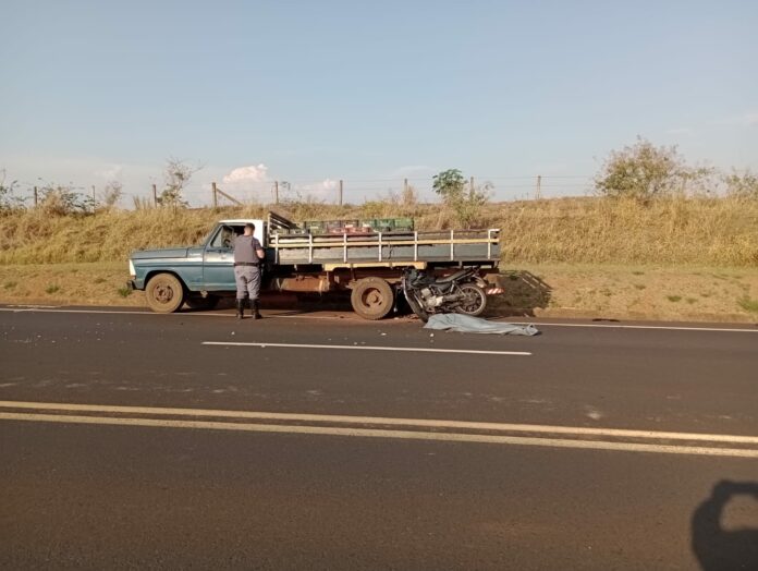 A vítima pilotava sentido norte quando, por causa que ainda deve ser investigada, colidiu contra o caminhão, carregado com frutas.