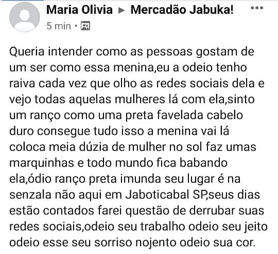 Na publicação, uma mulher identificada como Maria Olívia afirma que sente ódio da vítima, dizendo frases como “preta imunda seu lugar é na senzala e não aqui em Jaboticabal” e “odeio seu jeito, odeio esse seu sorriso nojento e odeio a sua cor”.