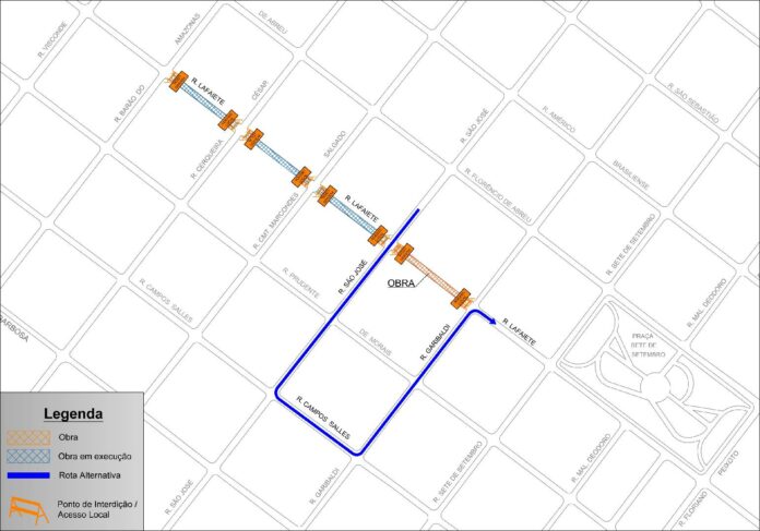 Com o andamento das obras do corredor de ônibus do quadrilátero Central, na manhã desta segunda-feira, 13 de maio, haverá a interdição total de mais um trecho da rua Lafaiete. Desta vez, o bloqueio na via será da rua São José até a rua Garibaldi. Os cruzamentos da Lafaiete com as ruas Comandante Marcondes Salgado, Garibaldi e São José ficarão com o trânsito livre.