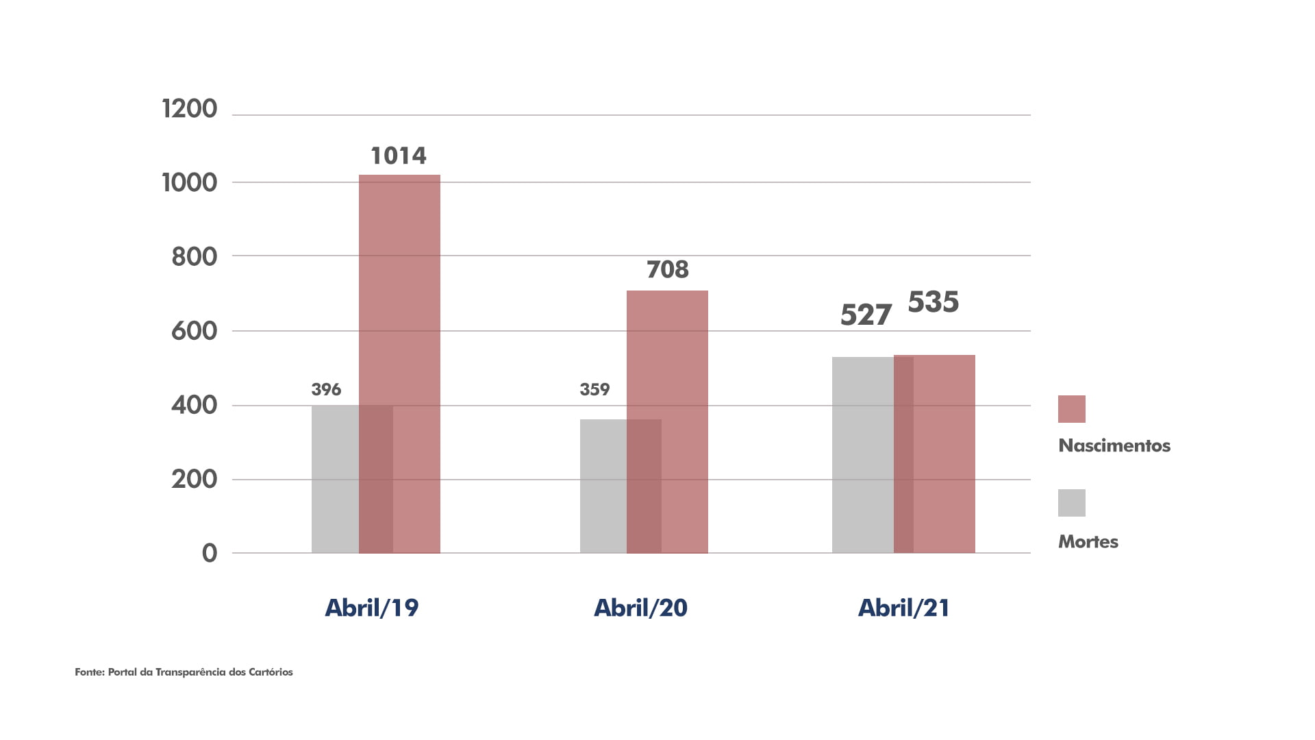Analisando-se os dados dos três anos, e projetando o total de nascimentos e mortes até o fim de abril de 2021, percebe-se que o total de nascimentos no mês de abril caiu da casa dos para a casa o patamar dos 700 – uma queda de aproximadamente 30%.