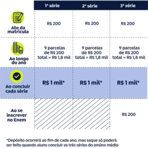 Ao comprovar matrícula e frequência, o estudante recebe o pagamento de incentivo mensal de R$ 200, que pode ser sacado em qualquer momento. O aluno também recebe depósitos de R$ 1 mil ao fim de cada ano letivo concluído com aprovação, que ficará como uma poupança e poderá ser sacados após a formatura no ensino médio.