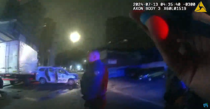 Depois, as imagens mostram que ele ligou para seu superior. “Bati a viatura. Bati a viatura, sub. Sofremos um acidente. Sofremos um acidente. Batemos a viatura. Arrebentou o carro. Juro por Deus, sub. Arrebentamos o carro do paisana aí. Juro por Deus, sub. Por favor, vem aqui. Como é que explica?”, diz ele.