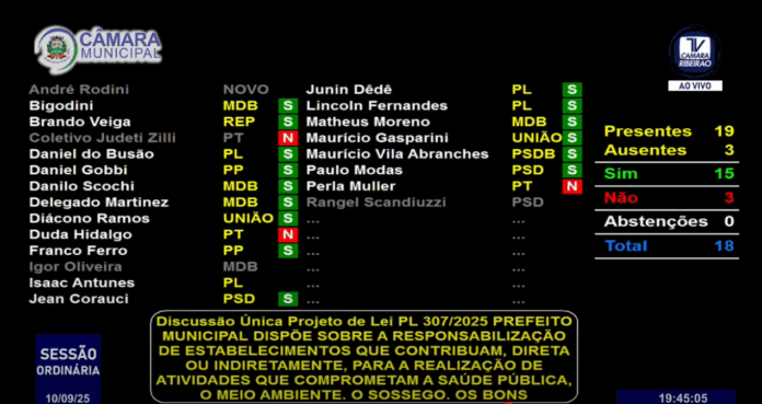 15 votos decidiram nesta quarta-feira (10), durante a 58ª Sessão Ordinária, a aprovação do Projeto de Lei N° 307/2025 que responsabiliza estabelecimentos por atividades que afetem os bons costumes e o sossego no município – como pancadões e bailes em vias públicas.