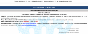 A Sessão Pública será aberta ainda em setembro, no dia 30, a partir das 9 horas. A retirada do Edital deve ser feita diretamente no site www.gov.br/compras ou gratuitamente para consulta através do site www.ribeiraopreto.sp.gov.br.