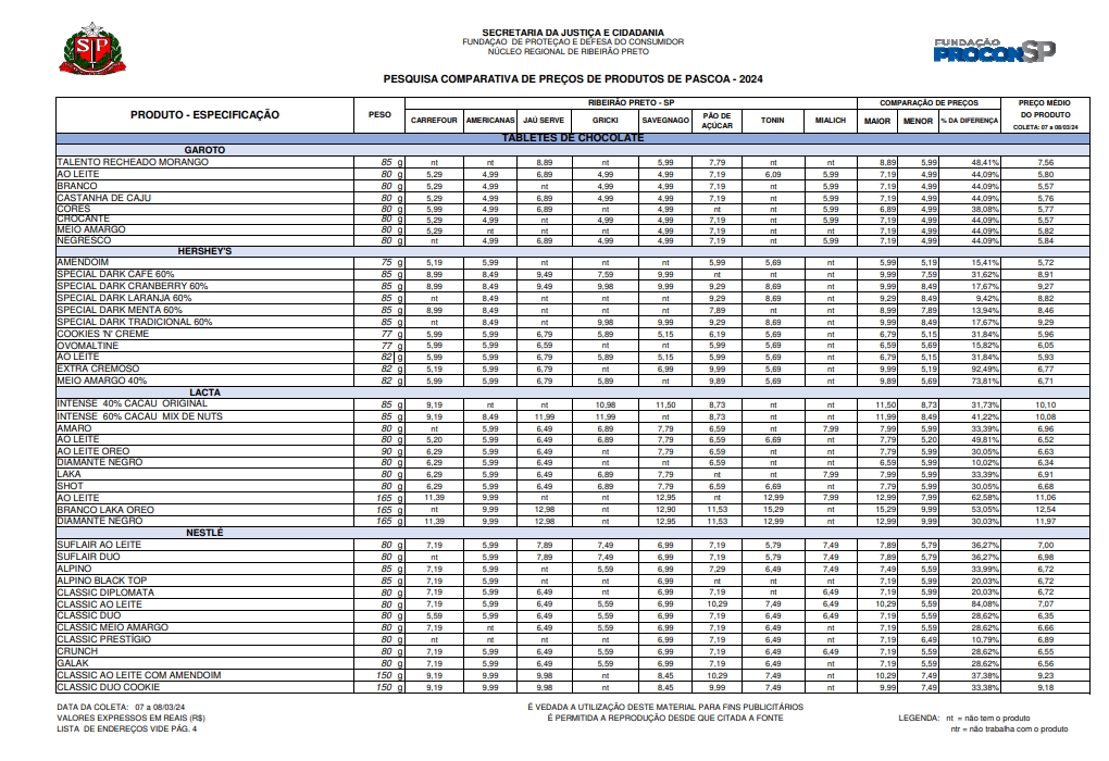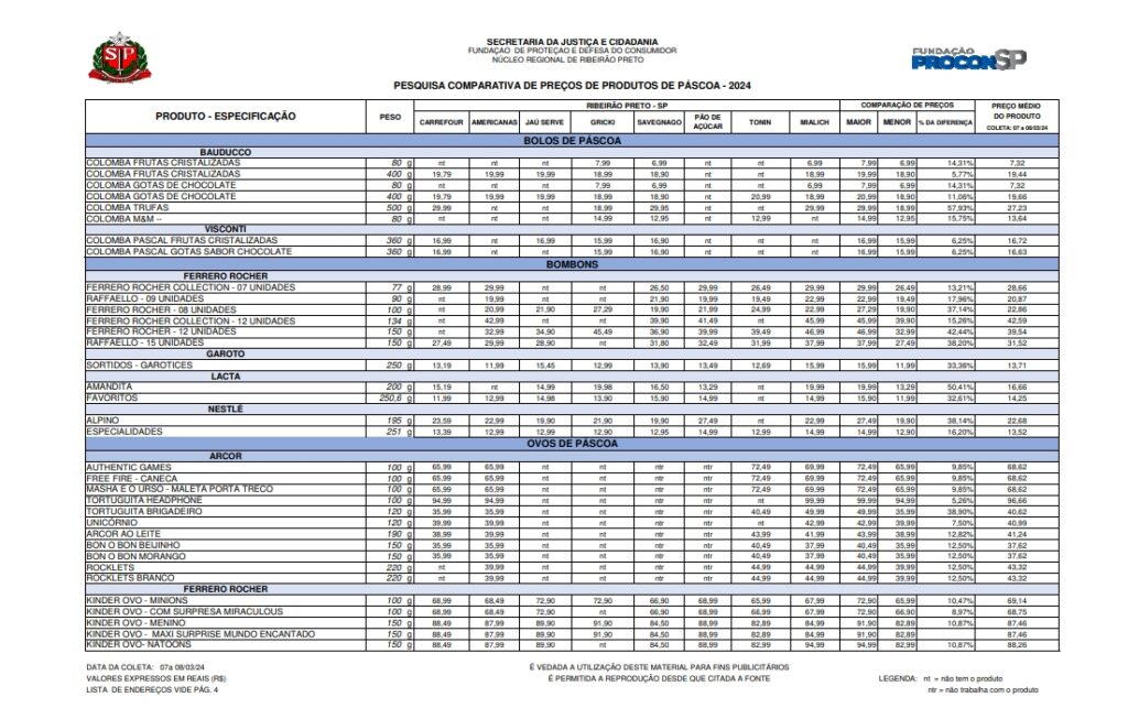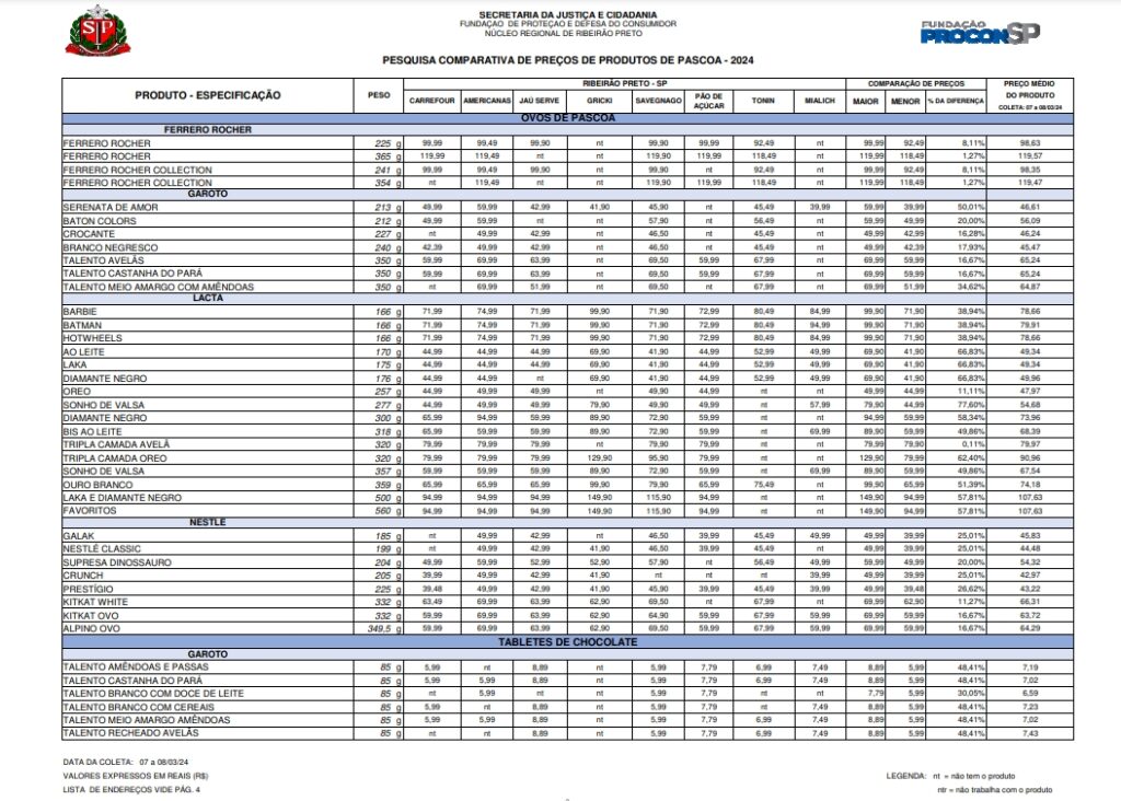 O Procon-SP realizou um levantamento de preços de produtos de Páscoa (ovos e bolos de Páscoa, bombons e tabletes de chocolate de diferentes tipos e marcas), com o objetivo de orientar e oferecer uma referência ao consumidor para ajuda-lo em sua decisão de compra.