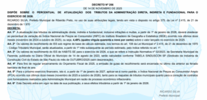 A Prefeitura de Ribeirão Preto, por meio do Decreto N° 256, publicado no Diário Oficial desta terça-feira (18), confirmou o reajuste de 4,49% no valor dos tributos municipais a partir do primeiro dia de 2026.