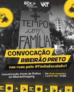 Em Ribeirão Preto, os movimentos sociais acompanharão o calendário nacional e farão ato pelo fim da escala de trabalho 6×1 no município, no dia 15 de novembro. A concentração será no ponto de ônibus do Ribeirão Shopping, a partir das 10h.
