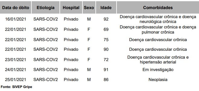 As mortes ocorreram entre os dias 16 e 25 de janeiro e vitimaram três homens e quatro mulheres. O paciente mais novo foi uma mulher de 69 anos e o mais velho um homem de 92 anos. Seis pacientes tinham comorbidades.