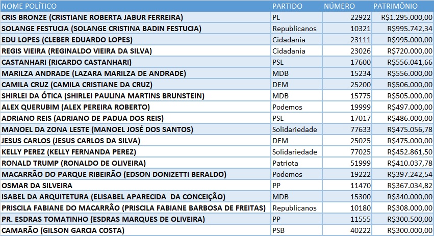 Em Ribeirão, Cris Bonze, candidata pelo PL, recebeu o auxílio mesmo tendo patrimônio de R$ 1,2 milhão. Outros dois candidatos – Solange Festucia (Republicanos) e Edu Lopes (Cidadania) declararam patrimônio igual ou superior a R$ 995 mil e integram a lista dos mais ricos beneficiados pelo auxílio do governo. Veja a lista completa abaixo: