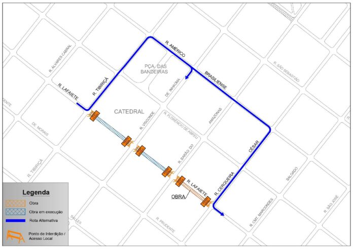 Com o andamento das obras do corredor de ônibus do quadrilátero Central, no início da tarde desta terça-feira, dia 23 de abril, haverá a interdição total do trecho da rua Lafaiete, entre a rua Barão do Amazonas e Cerqueira César. Os cruzamentos das ruas Barão do Amazonas e Cerqueira César ficarão com o trânsito livre.