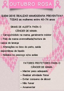 As ações fazem parte da campanha Outubro Rosa, conscientização para o Controle do Câncer de Mama e do Colo do Útero, celebrada anualmente, e têm o objetivo de compartilhar informações, proporcionando maior acesso aos serviços de diagnóstico e tratamento, contribuindo para a redução da mortalidade.