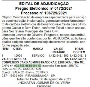 A empresa venceu uma licitação no valor de R$ 1.432.048,18 em agosto de 2021. O contrato é válido até 20 de dezembro de 2023, sendo esta notificada pela prefeitura do município em julho pelo descumprimento do contrato. Na ocasião, a Convênios Card teve de pagar uma multa de R$ 9 mil.