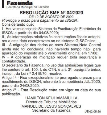 “A migração dos dados ao novo Sistema Nota Control ainda não foi concluída, não havendo tempo hábil para apuração do imposto até o vencimento original em 17 de agosto”, diz a portaria. O novo prazo passa a ser 24 de agosto.