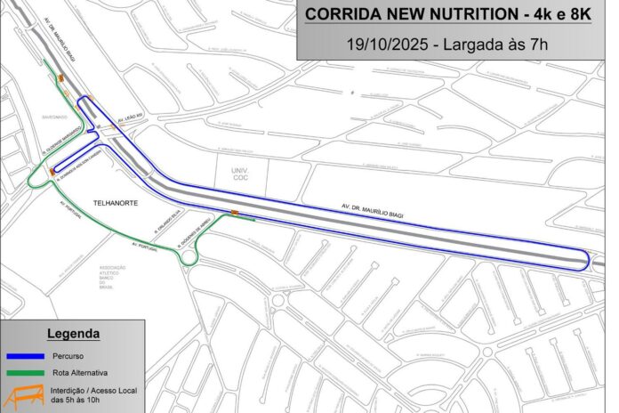 A RP Mobi informa que, neste domingo (19), entre 5h e 9h, serão realizadas interdições em trechos da avenida Maurílio Biagi e da rua Domingos Adilson Canesin, em razão da corrida de rua “New Nutrition”. O evento esportivo contará com percursos de 4 km e 8 km.