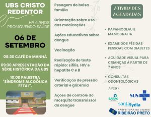 A UBS – Unidade Básica de Saúde Dr Luiz Gaetani, no bairro Cristo Redentor, em parceria com o Centro Universitário Barão de Mauá, promoverá, no dia 6 de setembro, uma série de atividades em saúde e de lazer para as mulheres do bairro.