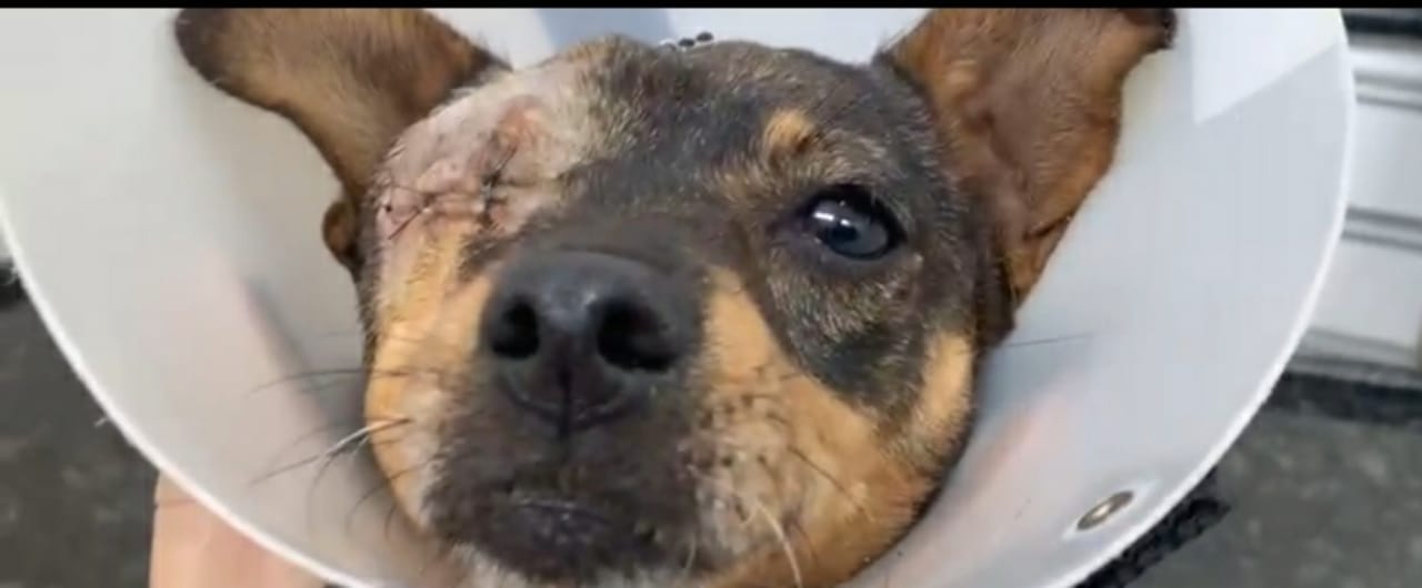 A cadela Mirla atingida com disparo de uma arma de pressão – “chumbinho” -, ficou cega do olho direito e foi diagnosticada com a doença do carrapato, relatou o médico veterinário Augusto Garcia da Costa.
