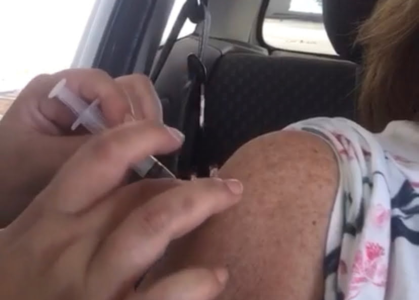 Nas imagens, é possível notar a agulha penetrando a pele da idosa, mas não é possível ver se, dentro da seringa, havia o imunizante. Depois de aparentemente simular a aplicação, a enfermeira passa algodão na pele e coloca um adesivo no local.