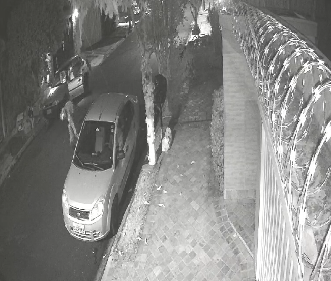 Na imagem, o homem, que já foi detido pela polícia, aparece deixando a motocicleta – tocada por um companheiro de crime ainda não identificado – com destino ao carro da vítima, estacionado na rua Ari da Silva Galvão.