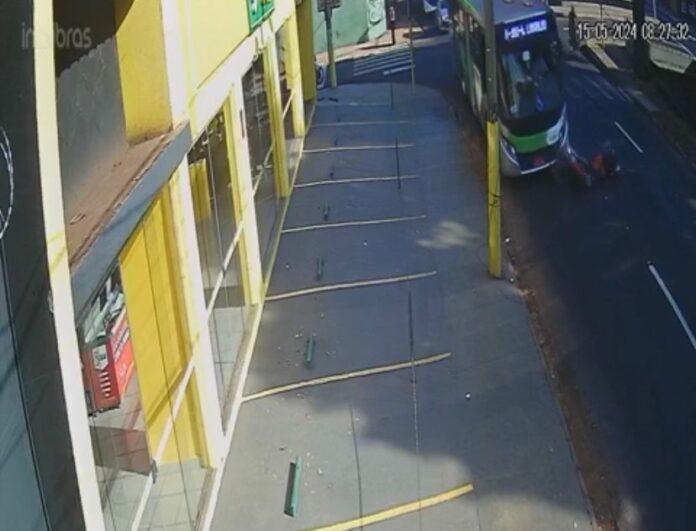 Na imagem, a moto aparece colidindo com um carro antes de ser atingida pelo ônibus. Todos os envolvidos seguiam pelo mesmo sentido da avenida, localizada no setor central da cidade.