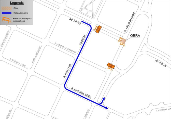 Com o andamento das obras de drenagem das galerias de águas pluviais na Vila Virgínia (região Oeste), nesta segunda-feira (16), será necessária uma nova interdição na avenida Pio XII. Desta vez, será cruzamento da pista Bairro/Centro da via com a pista com a rua Abílio Sampaio.