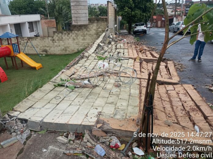 O incidente principal ocorreu por volta das 15h30, quando a força dos ventos provocou o desabamento de um muro na Escola Municipal Tio Barnabé, localizada na Rua Salvador Carnevale, no bairro São Francisco de Assis.