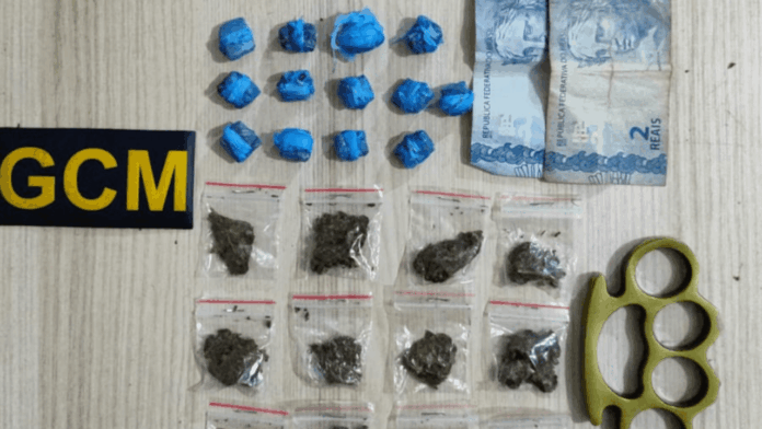 Com outro abordado, os guardas localizaram R$ 107 em dinheiro. Próximo a ele, foram encontradas 12 porções de maconha e um soco inglês. O suspeito negou a prática de tráfico, afirmou que o dinheiro era proveniente de seu trabalho e que a droga não lhe pertencia.