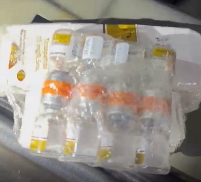 Os policiais descobriram um compartimento oculto no porta-malas, onde estavam escondidas 104 ampolas de Tirzepatida (medicamento para diabetes tipo 2, popularmente usado para emagrecimento), dois frascos de anabolizantes, quatro produtos para emagrecimento e sete iPhones, todos sem comprovação legal de importação.