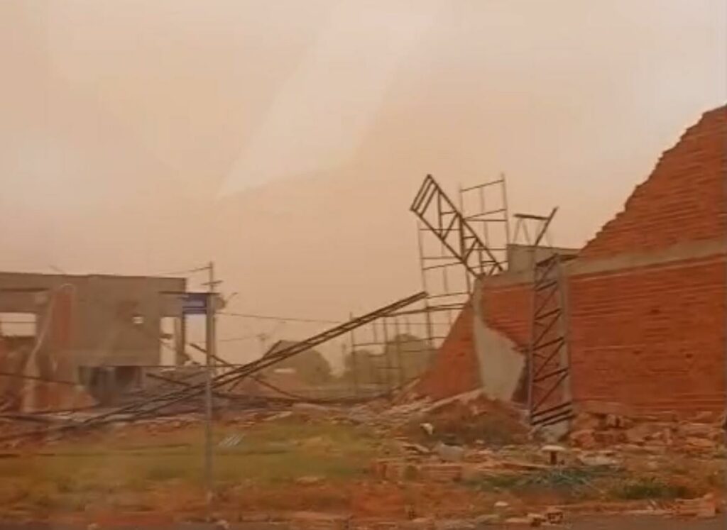 Com a força do vento, um barracão em construção no Residencial Costa Ville desabou parcialmente, provocando prejuízos.