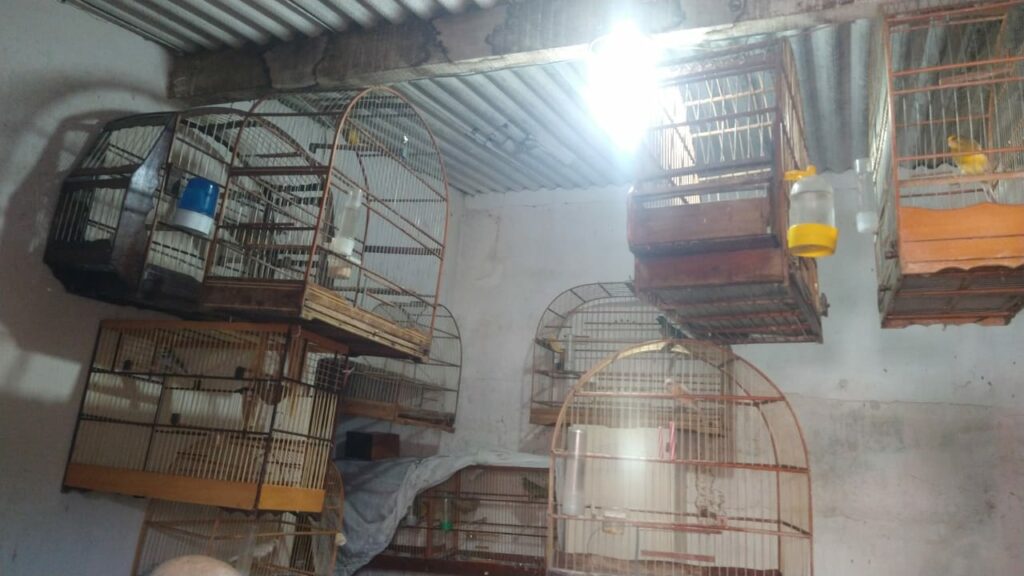 Na área externa da residência, em um corredor e em um cômodo nos fundos, foram encontradas várias gaiolas penduradas nas paredes e sob o telhado, contendo aves silvestres, híbridas e domésticas.