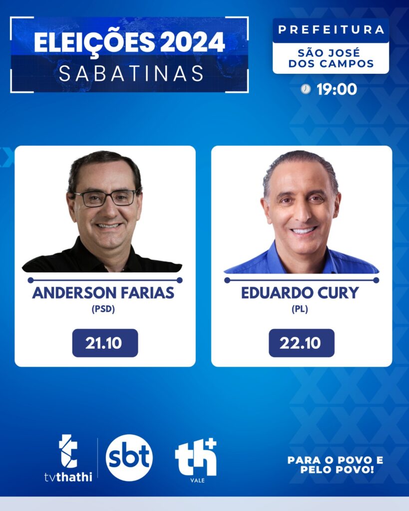 A TV Thathi SBT continua promovendo sabatinas com os candidatos que disputam o 2º turno das eleições para prefeito em Taubaté e São José dos Campos. As sabatinas começam às 19h, no programa Tá na Hora Vale, com apresentação de Vinícius Valverde.