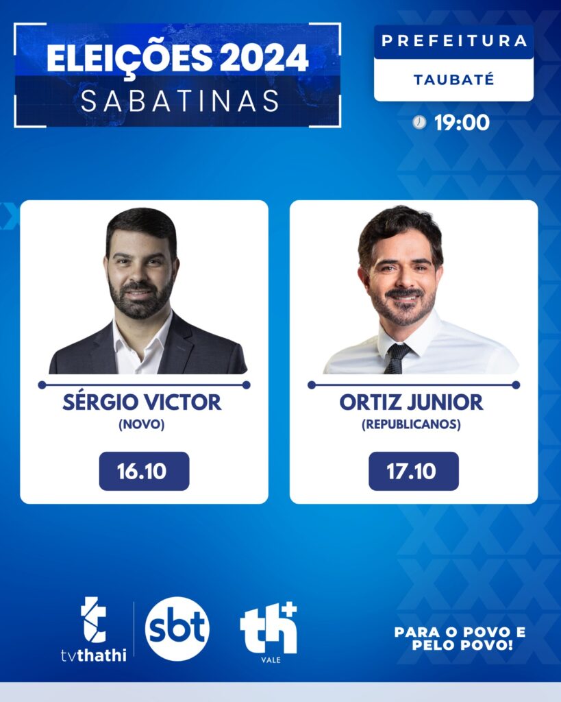 Em mais uma ação pelo fortalecimento da democracia, a TV Thathi SBT promove sabatinas com os candidatos que disputam o 2º turno das eleições para prefeito em Taubaté e São José dos Campos. As sabatinas começam às 19h, no programa Tá na Hora Vale, com apresentação de Vinícius Valverde.