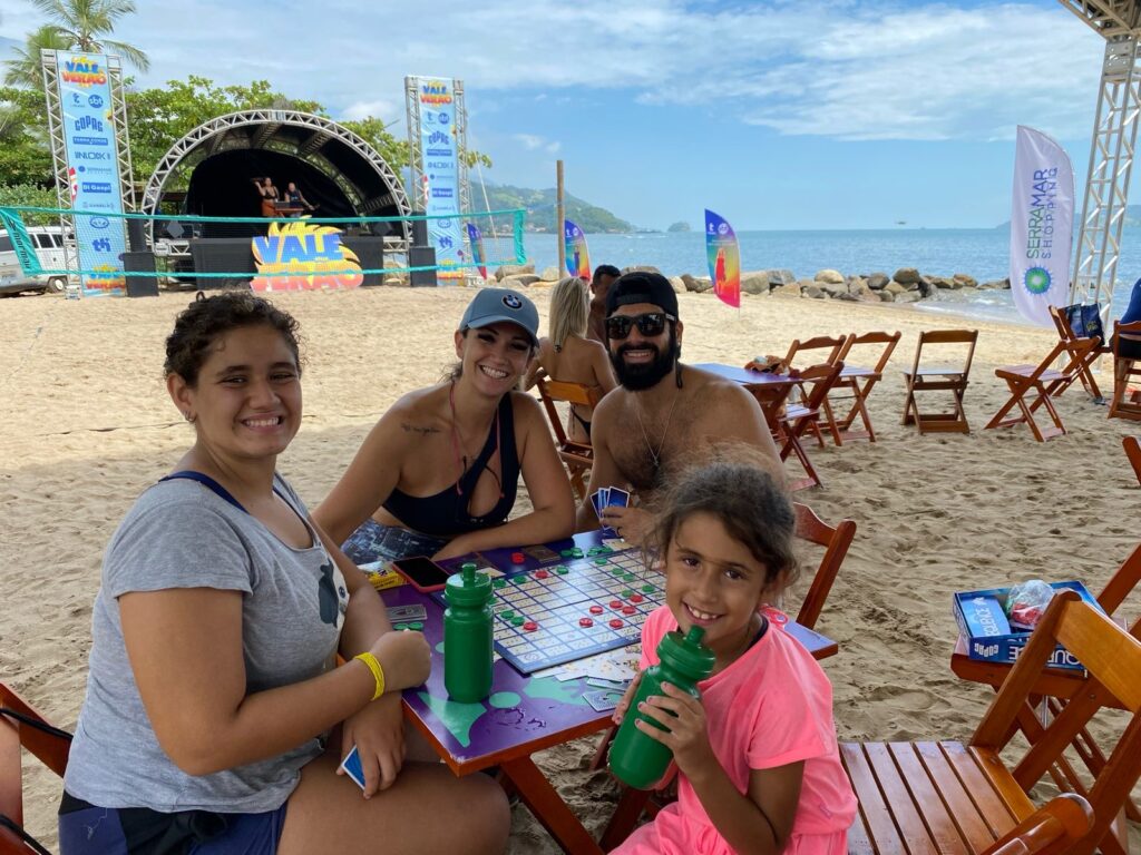 O casal André e Nathalie Fernandes aproveitou a Arena Vale Verão na Praia do Perequê, em Ilhabela, para jogar truco com as filhas, Maria Eduarda e Paola Vecchio. “Eu estava pedalando pela praia quando ouvi a música e aproveitei para jogar com minhas filhas. Na beira da praia é bem melhor e esse evento é diferente de todos aqui na Ilha, muito bom para juntar toda a família”, disse os moradores da Ilha.