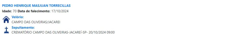 A informação foi confirmada pela Urbanizadora Municiapl (Urbam), que informou que o velório ocorreu no Campo das Oliveiras, em Jacareí, e a cremação foi no crematório do local.