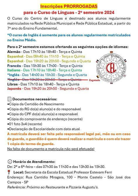 O Centro de Estudo de Línguas (CEL) em São José dos Campos está com vagas abertas para o segundo semestre de 2024. Os cursos são direcionados a alunos matriculados em escolas públicas de forma totalmente gratuita com direito a certificado. As inscrições poderão ser realizadas até o dia 9 de agosto.