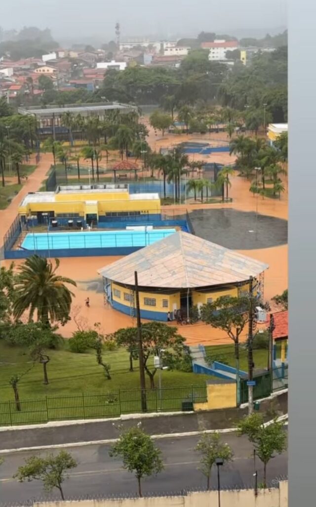 O Centro Poliesportivo do bairro também sofreu com a chuva forte. O local ficou alagado e com lama.