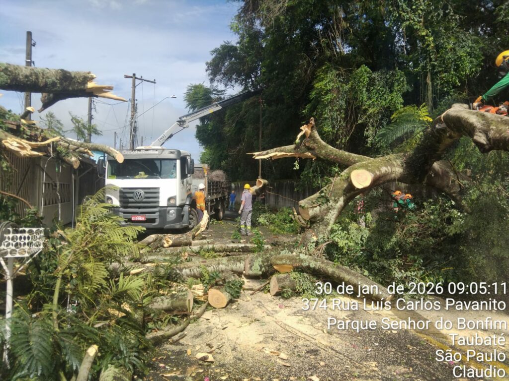 A queda de uma árvore de grande porte mobilizou equipes da Defesa Civil e do Corpo de Bombeiros no início da manhã desta sexta-feira (30), no bairro Bonfim, em Taubaté. A árvore, com aproximadamente 15 metros de altura, desabou por volta das 6h na Rua Luiz Carlos Pavanitto, atingindo quatro residências e a fiação elétrica da via.