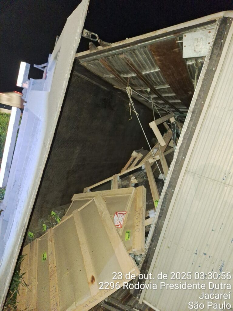 Um caminhão que levava caixas de madeira tombou na madrugada desta quinta-feira (23) na Rodovia Presidente Dutra, em Jacareí.