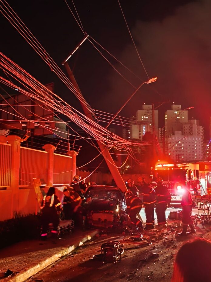 Segundo o Corpo de Bombeiros, a ocorrência foi registrada por volta das 22h05, quando um veículo colidiu contra um poste, que acabou caindo sobre o carro.